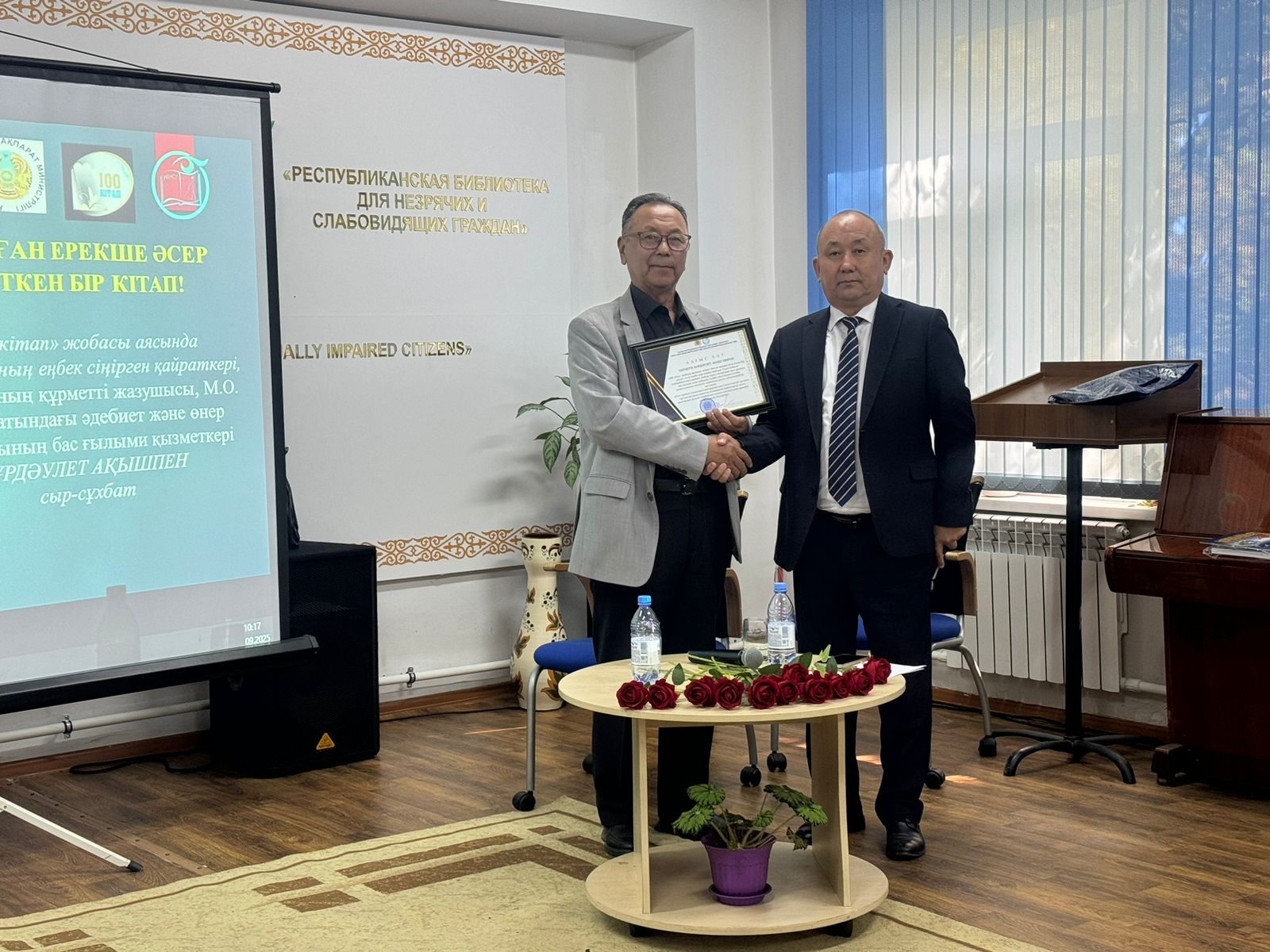 Зағип және нашар көретін азаматтарға арналған республикалық кітапханасында 2025 жылдың 30 қыркүйегінде «100 кітап» жобасы аясында «100 кітапты оқып көрейік» тақырыбында Қазақстанның еңбек сіңірген қайраткері, Қазақстанның құрметті жазушысы, М.О. Әуезов атындағы әдебиет және өнер институтының бас ғылыми қызметкері